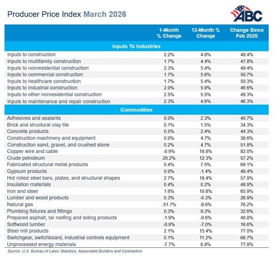 The energy picture was mixed. Natural gas prices dropped 51.7% and unprocessed energy materials fell 7.7% last month. Crude petroleum, however, surged 20.2% in March and is doing most of the damage. ABC Chief Economist Anirban Basu attributed the spike directly to conflict in Iran, noting the full impact on construction input costs is still unfolding.