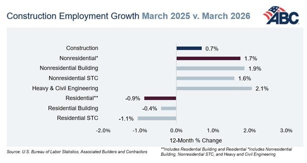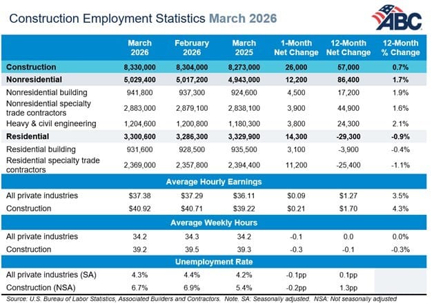 The construction industry added 26,000 jobs in March, according to an Associated Builders and Contractors analysis of Bureau of Labor Statistics data. Year over year, industry employment has grown by 57,000 positions, a 0.7% increase.