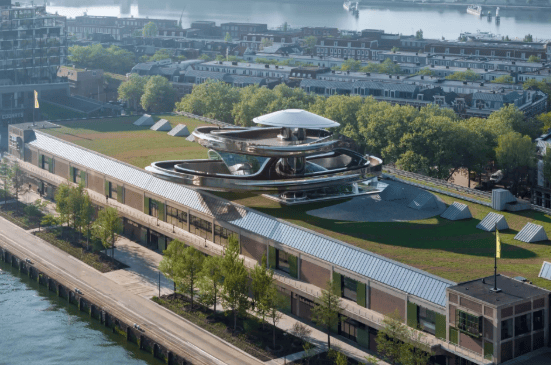 The museum combines adaptive reuse of the original 16,000 m² (172,000 sq ft) 1923 warehouse with a striking new steel “Tornado” structure. The Tornado forms a dramatic helix above the roofline, linking the heritage building with the new volumes and symbolizing the complex journeys of global migration.